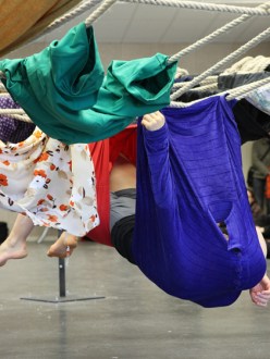 First performed in 1970 in New York City’s downtown Soho neighbourhood by Trisha Brown and Carmen Beuchat, “Floor of the Forest” consists of a sculptural steel frame holding up a web of ropes that have been threaded with colourful used clothing. Placed at eye-level, this horizontal plane becomes a soft platform for two dancers to negotiate. Climbing onto the apparatus, the dancers weave their way across the structure by putting on and then taking off the clothing, occasionally pausing to […]